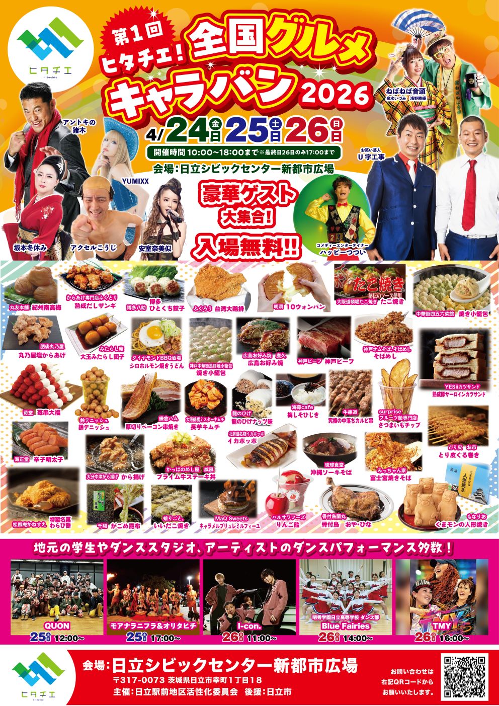 【4/24~4/26】ヒタチエ全国グルメキャラバン2026|日立シビックセンター新都市広場|グルメフェス 2026-04-08 最終更新日時 : 2026-04-08 seinoヒタチエ全国グルメキャラバン初開催!全国各地の人気グルメや絶品スイーツが大集合!お笑い芸人や地元ダンスチームのステージイベントも充実!日時2026年4月24日(金)~4月26日(日)の3日間10:00~18:00 ※最終日は17:00まで場所日立シビックセンター 新都市広場(屋外)〒317-0073 茨城県日立市幸町1丁目18 料金入場無料 ※飲食は有料問い合わせ先主催:日立駅前地区活性化委員会後援:日立市問い合わせはこちら